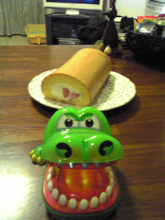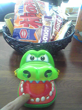 おやつカゴの前に悠然と立ちはだかるこのワニに咬まれたら、おやつは食べれないというもの。