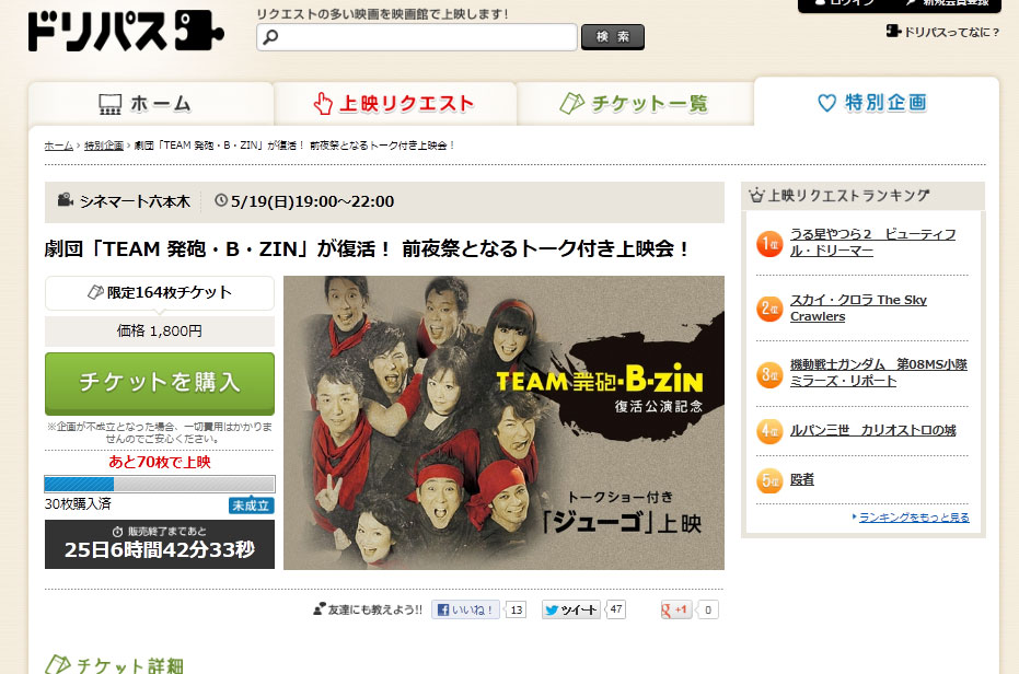 僕は知らなかったんだけど、チケット購入が100枚を超えると映画館で上映してもらえるというものみたい。